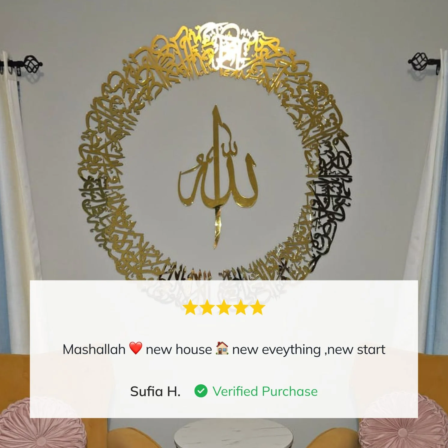 Crafted from high-quality acrylic & wood, this Islamic home decor features the Ayatul Kursi in beautiful calligraphy, adding a touch of spirituality and grace to your living room. The circular shape represents unity and endlessness, symbolizing the divine nature of this powerful verse from the Quran. This unique Ayatul Kursi Calligraphy Islamic Wall Art is also an ideal Ramadan Decor for your walls. An ideal choice for a thoughtful Muslim gift, our Islamic home decor enhances the ambiance during Ramadan and Eid Mubarak.