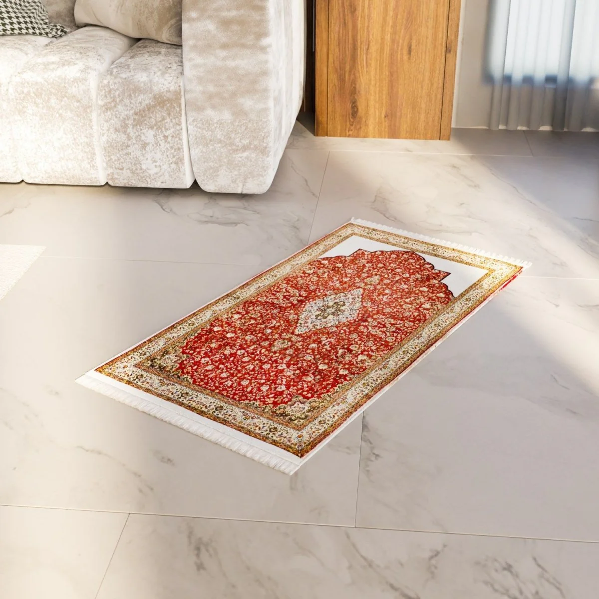 This prayer rug is designed to enhance your prayer experience with its soft, plush surface and elegant floral motifs. The deep red patterns add a touch of warmth and spirituality, making it more than just a functional item. The soft acrylic material ensures that this muslim prayer mat is gentle on the skin, offering comfort for prolonged use during Salah. Its foldable and lightweight design makes it convenient for both home and travel use.