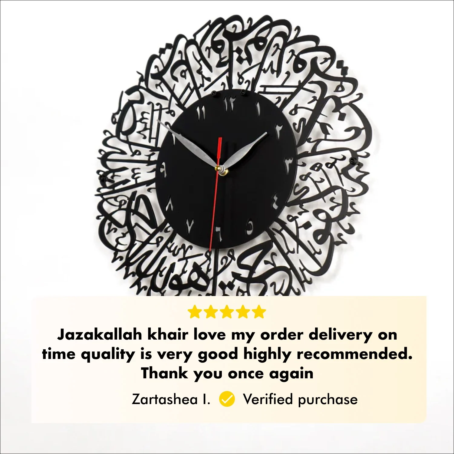 This stunning clock, adorned with Islamic calligraphy of Surah Al Ikhlas, symbolizes the purity and unity of Allah, offering a timeless statement in Islamic home decor. Ideal as a profound Muslim gift, it enhances any space with its deep message and elegant presence, making it a perfect addition to collections of Islamic art, Islamic wall art, and Quran wall art. Enhance your Ramadan decorations and celebrate Eid Mubarak with a touch of elegance that resonates with faith and tradition.